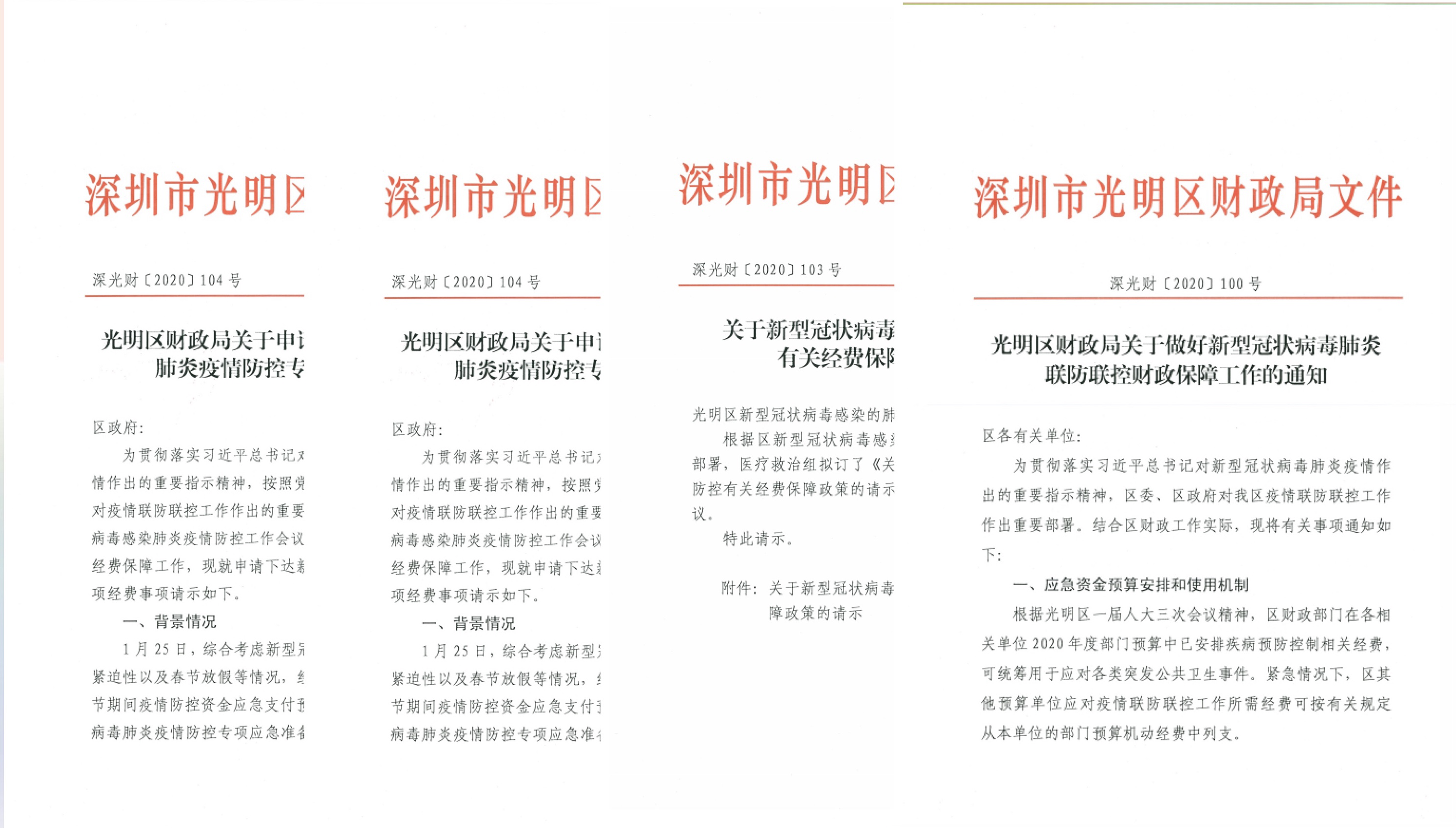 ——资金保障、政策落实到位。光明财政第一时间启动资金应急保障机制,畅通资金支付绿色通道,简化政府采购程序,落实患者和疑似病例救治费用补助政策、参加防治工作人员补助政策,做好疫情防控专用设备和试剂、指定隔离安置点补贴等经费保障工作,全力同时间赛跑,助力织密织牢疫情防控网,坚决打赢疫情防控阻击战。
