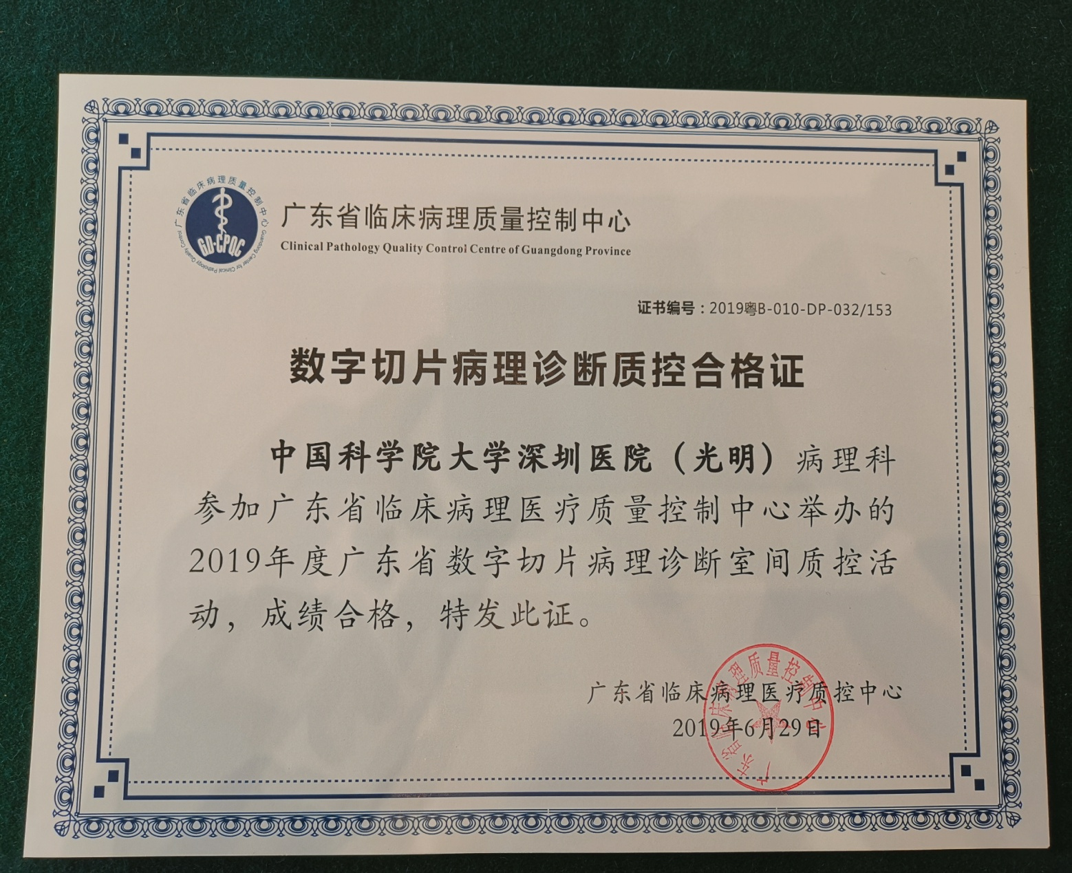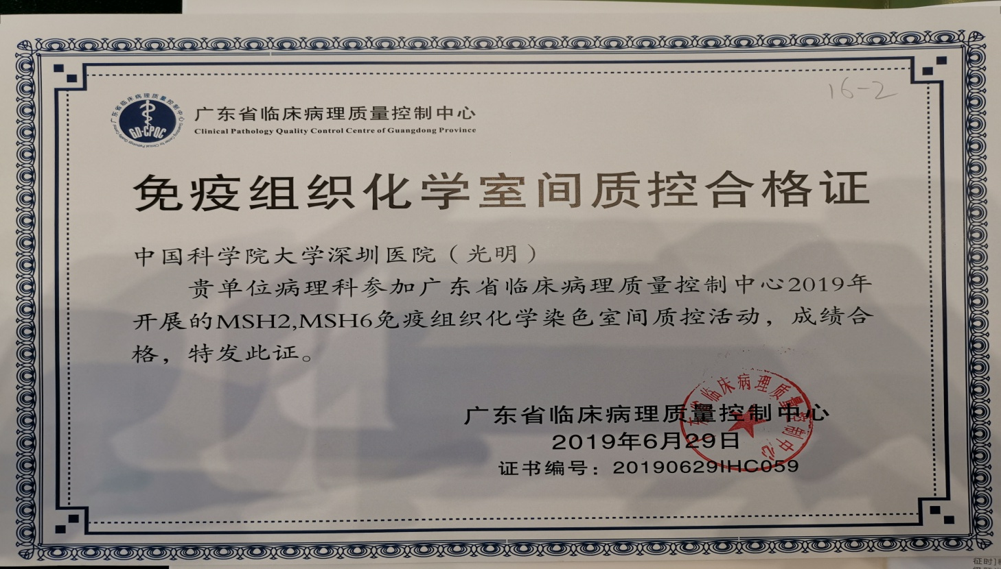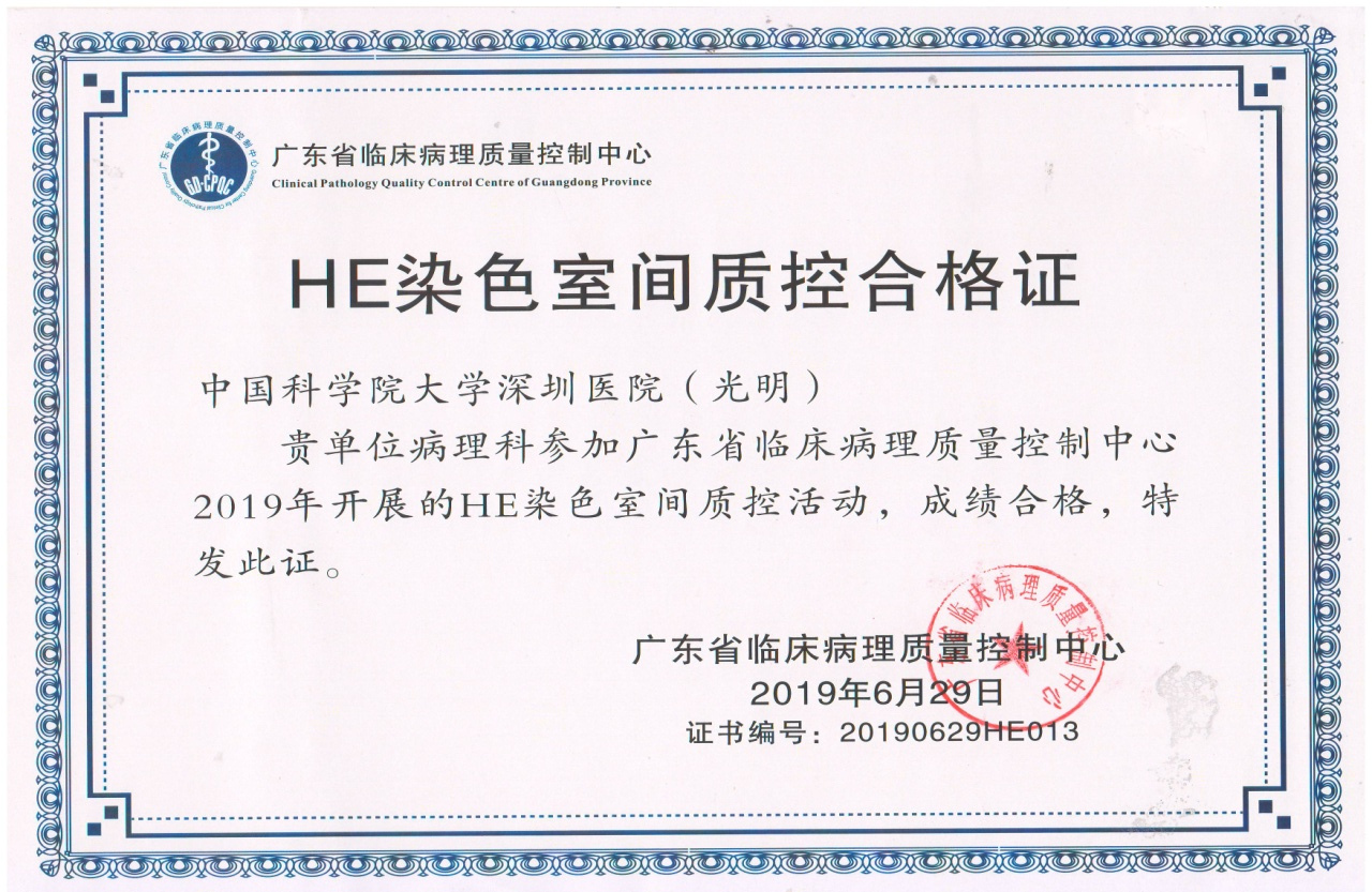 2019年6月29日,广东省临床病理质量控制中心在广州举办了2019年广东省临床病理质量控制年会。会上,广东省临床病理质量控制中心主任和省质控专家为数字切片病理诊断、HE染色室间质控、免疫组织化学室间质控合格的单位颁发了证书,国科大深圳医院(光明)病理科均获颁合格证书。
