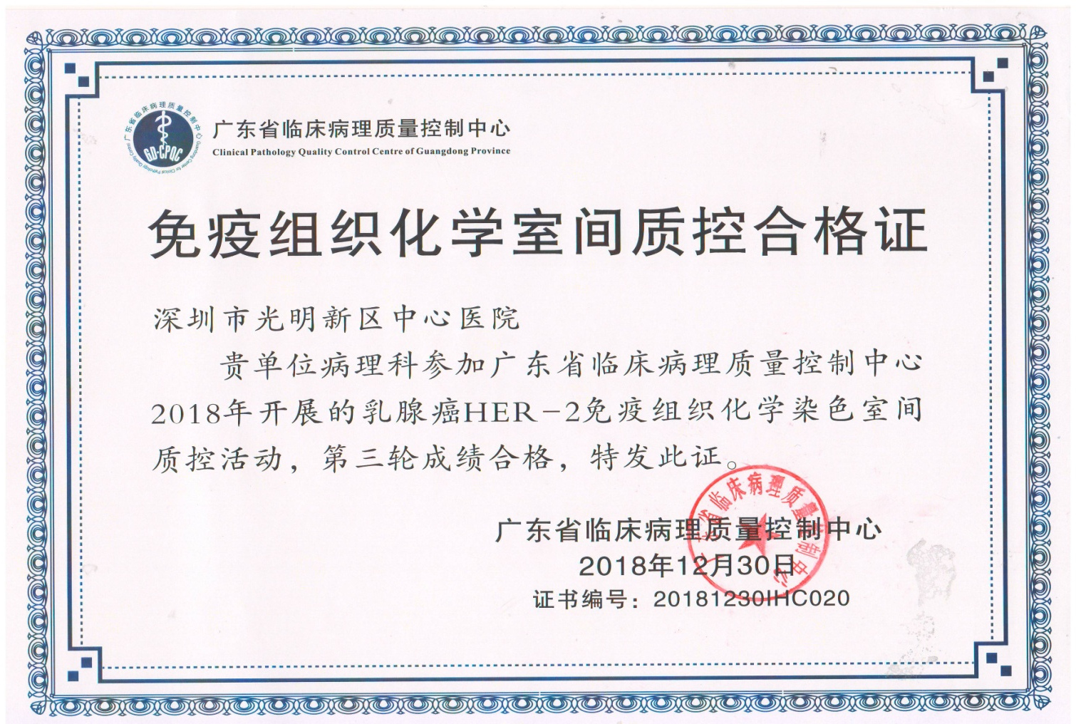 免疫组化在病理诊断中的作用已经得到广泛的认同。由于免疫组化是一个多步骤、多因素决定的实验方法,各实验室采用的组织处理与染色方法不同、抗体克隆号和来源不尽相同,因此染色结果良莠不齐。质差的染色切片可能误导最终的病理诊断,产生严重后果。此次获得省临床病理质控中心“免疫组织化学室间质控合格证”充分说明国科大深圳医院(光明)病理科免疫组化染色的可靠性。