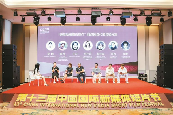 ▲第十三届中国国际新媒体短片节“跟着微短剧去旅行”精品剧目代表经验分享活动现场。