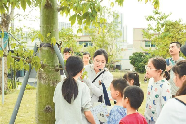 此次活动通过实地观察、沉浸式体验、问答交流等形式,增进人才子女对自然科学的了解,进一步彰显“田园都市”魅力,擦亮“科学新湖”名片。在探索认识树叶环节,自然导师充分利用科学公园丰富的植物,借助生动有趣的彩叶植物图鉴卡,让孩子们置身于大自然的怀抱,观赏榕树、番石榴树、落羽杉等特色树种,通过视觉、嗅觉、触觉等多重感官体验,了解不同叶子的形状结构。在这片被科学与艺术温柔拥抱的土地上,孩子领略到属于新湖的秋季美好。