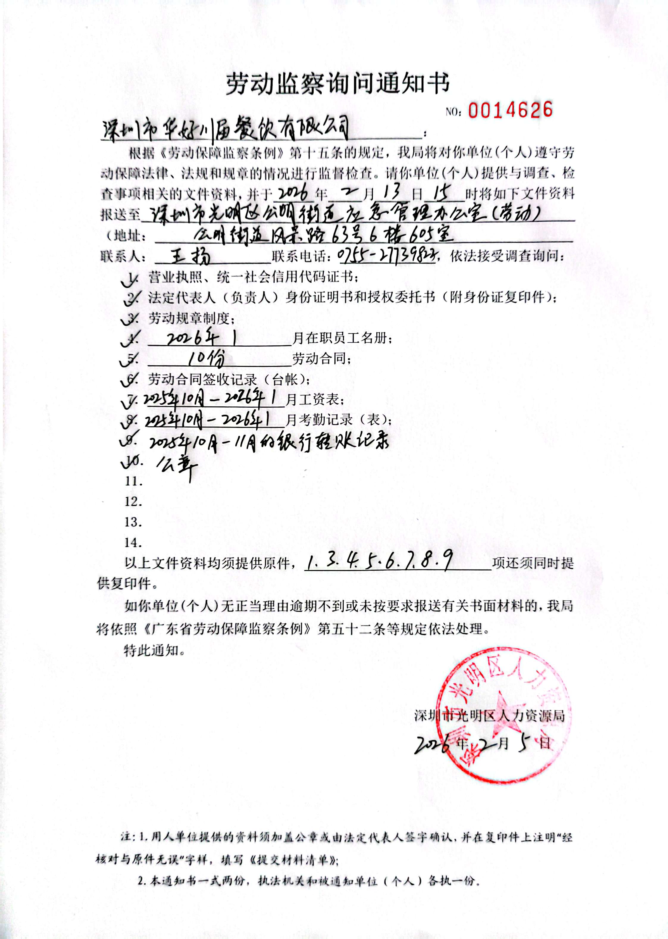 我局在调查你单位涉嫌无故拖欠员工工资一案时,因通过登记住所和联系电话均无法与你单位取得联系。现依照《广东省劳动保障监察条例》第四十七条规定向你单位公告送达《劳动监察询问通知书》(NO:0014626),请你单位按照劳动监察部门的要求报送书面材料至深圳市光明区公明街道应急管理办公室(地址:深圳市光明区公明街道风景路63号6楼605室;联系人:王先生;联系电话:0755-27739823)。