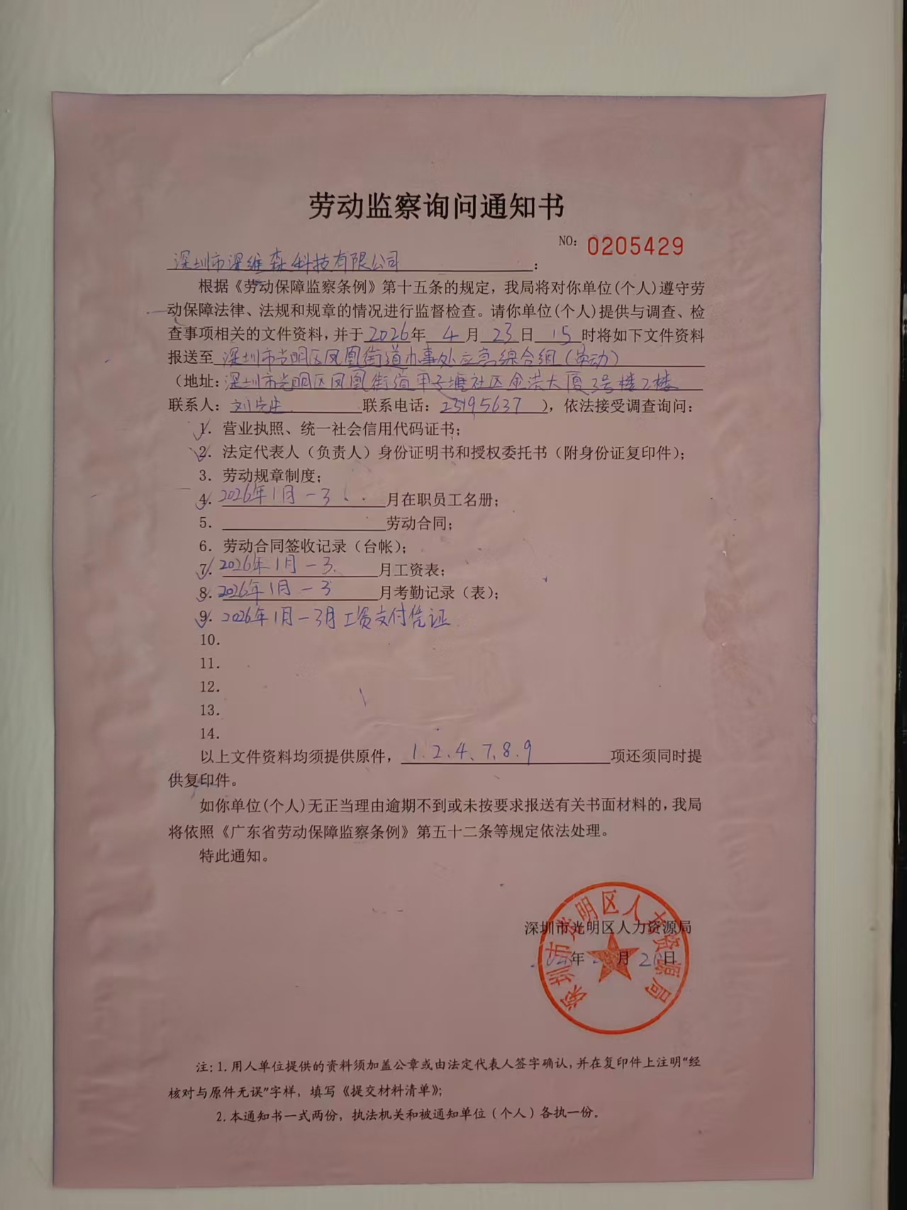 我局在调查你单位涉嫌无故拖欠员工工资一案时,因通过登记住所和联系电话均无法与你单位取得联系。现依照《广东省劳动保障监察条例》第四十七条规定向你单位公告送达《劳动监察询问通知书》(NO:0205429),请你单位按照劳动监察部门的要求报送书面材料至深圳市光明区凤凰街道应急管理办公室(地址:深圳市光明区凤凰街道甲子塘社区金洪大厦3号楼2楼;联系人:刘先生;联系电话:0755-23195637)。