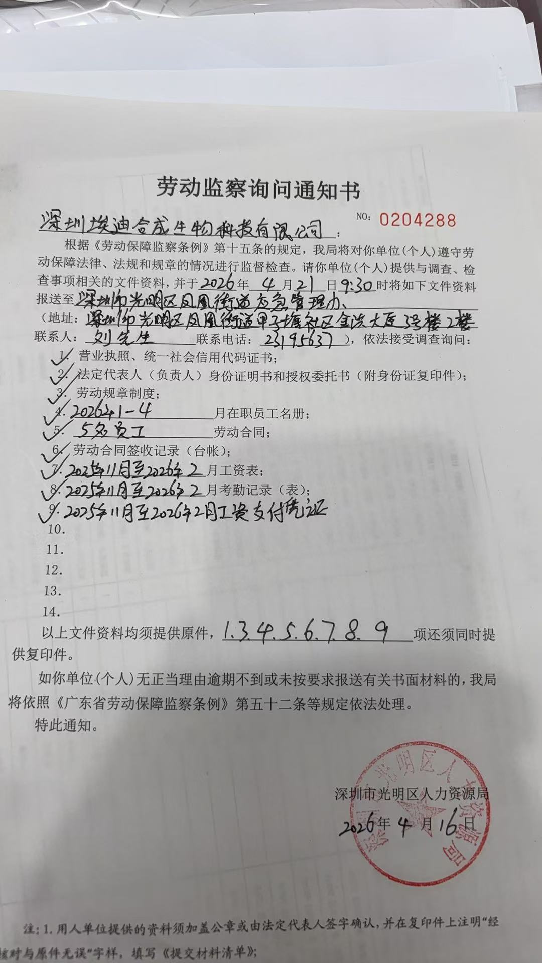 我局在调查你单位涉嫌无故拖欠员工工资一案时,因通过登记住所和联系电话均无法与你单位取得联系。现依照《广东省劳动保障监察条例》第四十七条规定向你单位公告送达《劳动监察询问通知书》(NO:0204288),请你单位按照劳动监察部门的要求报送书面材料至深圳市光明区凤凰街道应急管理办公室(地址:深圳市光明区凤凰街道甲子塘社区金洪大厦3号楼2楼;联系人:刘先生;联系电话:0755-23195637)。